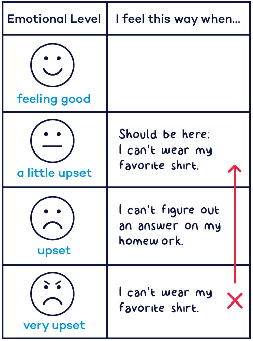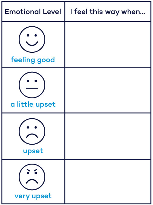 Create a visual aid that depicts the different levels of emotions that a child may feel, allowing the child to create their own labels for each level. For example, levels can be labeled “feeling good,” “a little upset,” “upset” and “very upset.” The chart should have two columns with the emotional levels in one column. Title the other column, “I feel this way when…” and leave the rows blank for the child to fill in.